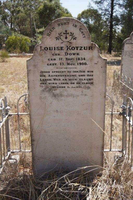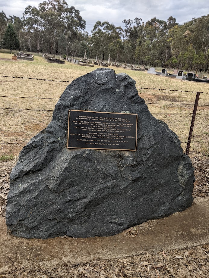 In 1868 they travelled overland, with other families, to Jindera in New South Wales. They farmed at Gerogery, where four more children were born: Friedrich, Martin, Ernst and Louise. The Kotzurs later farmed at Alma Park and finally at Pleasant Hills in New South Wales. They were true pioneers, clearing and developing land to use for agriculture in each of the places they lived.