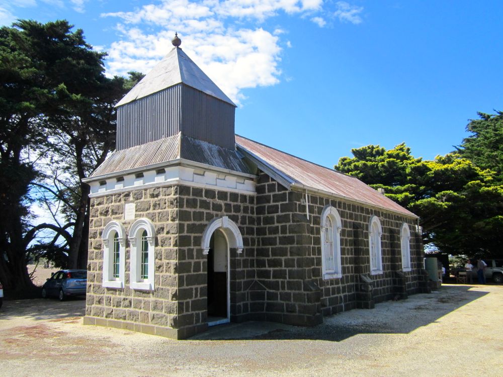 Their wattle and daub church called “Waldkirch”, meaning “church in the woods”, was dedicated on 9 Oct 1859 by Pastor C Schurmann of Hochkirch, now Tarrington. The present bluestone church in the style of “Romanesque Revival” and designed by R. S. Tufts, was completed in 1868. The Bible brought to Australia by Johann F. Seiffert was used for the services