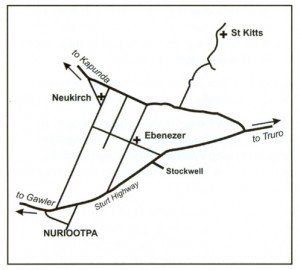To get to Neukirch: From Ebenezer keep going westward on Ebenezer Road. It is now an unsealed road. When you meet the bitumen road, turn right towards Kapunda. After 1km you reach the Neukirch church with the Wendish Pioneer Heritage Trail sign at the front. You can return to Nuriootpa by going southwards along the bitumen road (Belvidere Road) to the highway.